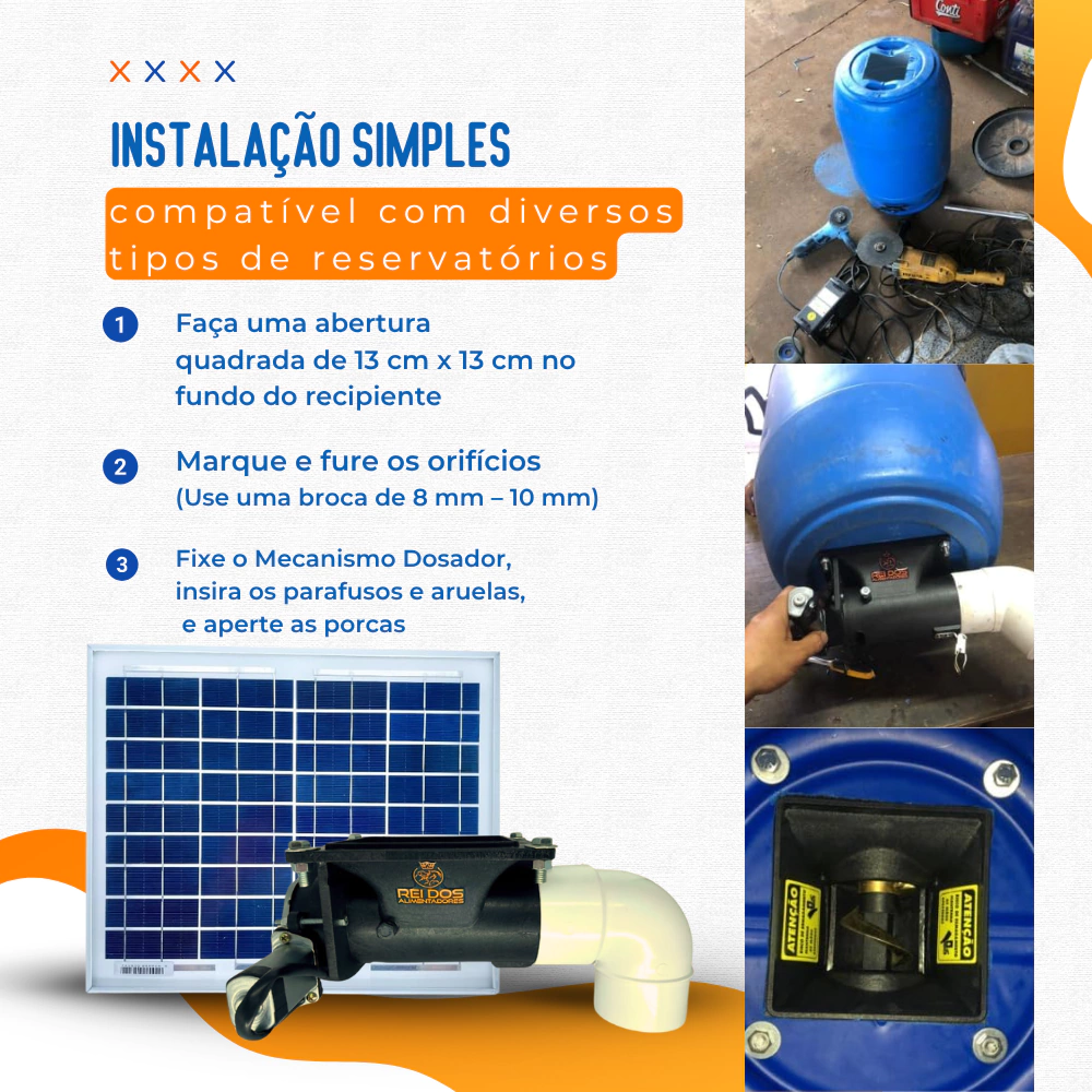 Mecanismo dosador automático de ração com kit solar e divisor y para dois animais